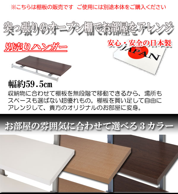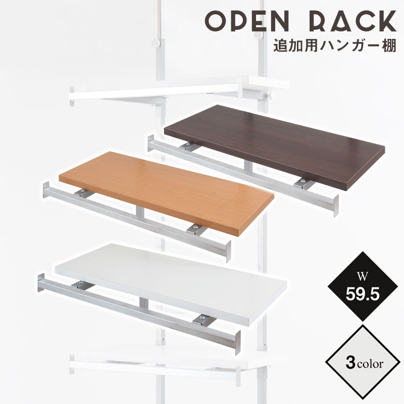 突っ張り壁面収納 無段階調整オープンラック 幅59.5cm用別売りハンガー棚 ホワイト色 ナチュラル色 ブラウン色