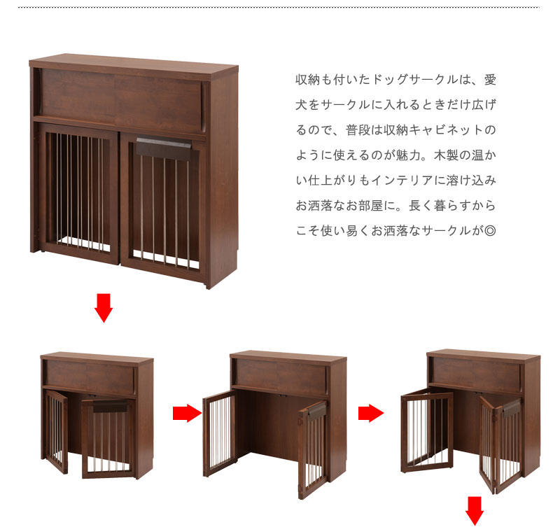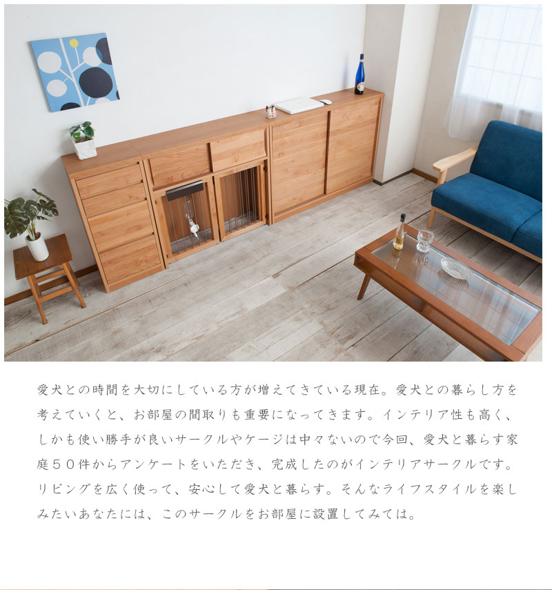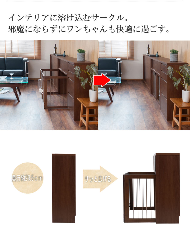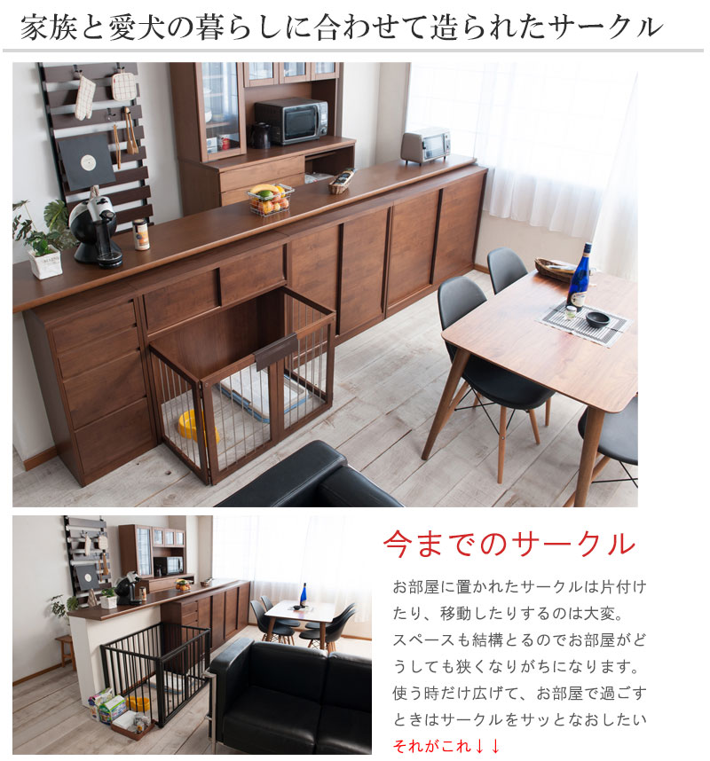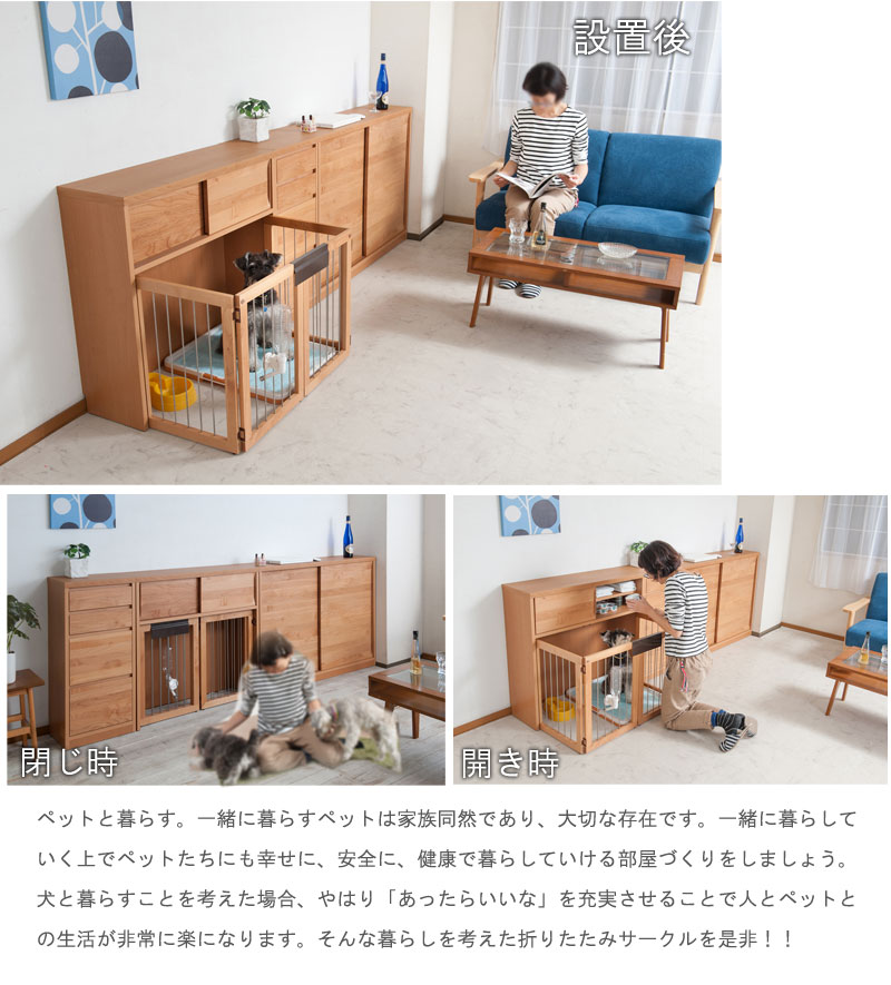 愛犬をサークルに入れるときだけ広げるので、普段は収納キャビネットのように使えるのが魅力。