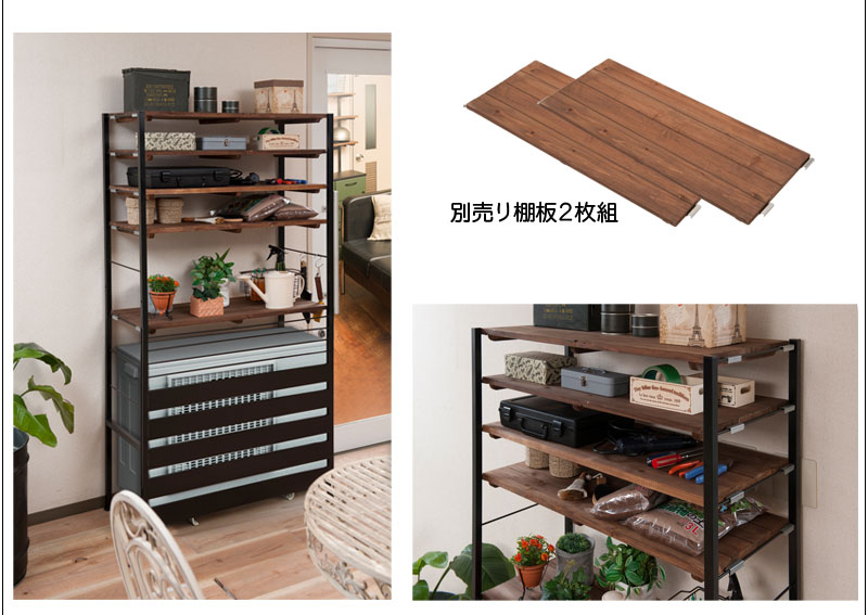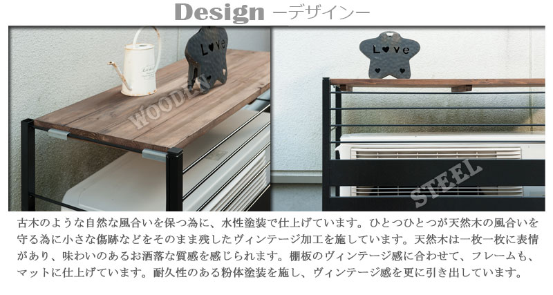 ■商品について/天板や棚板には古木調の天然木を使用し、フレームをスチールで仕上げた異素材の組み合わせがGood。