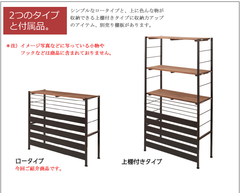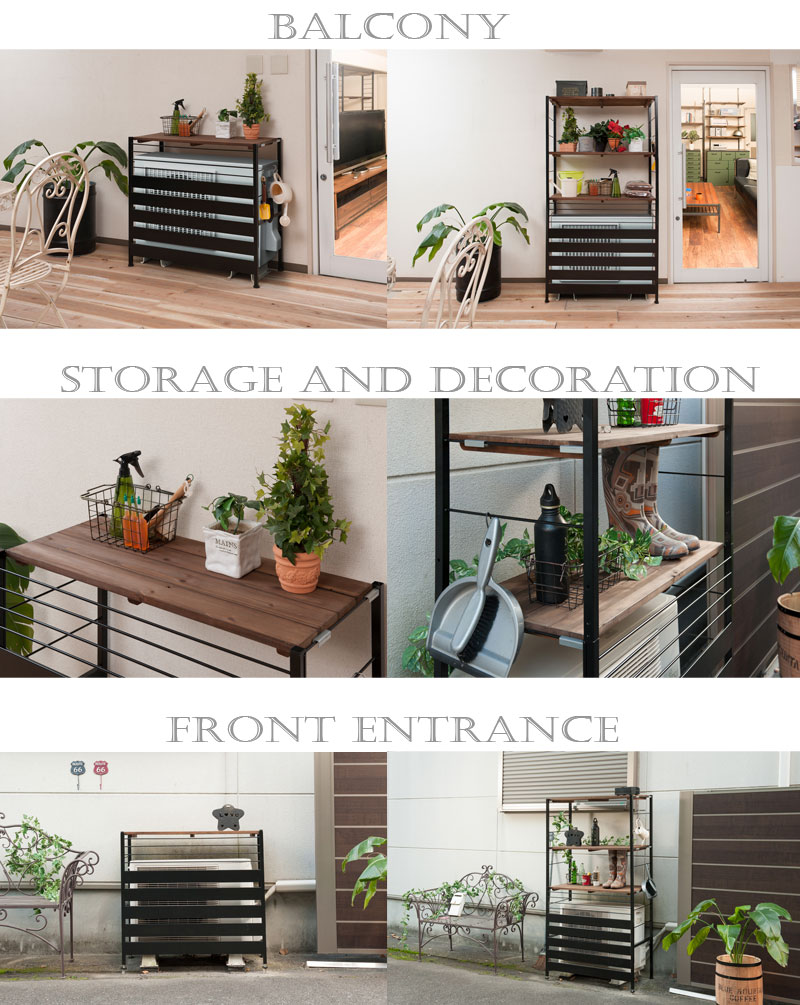 ガーデニング用品の収納やグリーンを飾るなど便利な上棚付きタイプとシンプルロータイプの展開。
