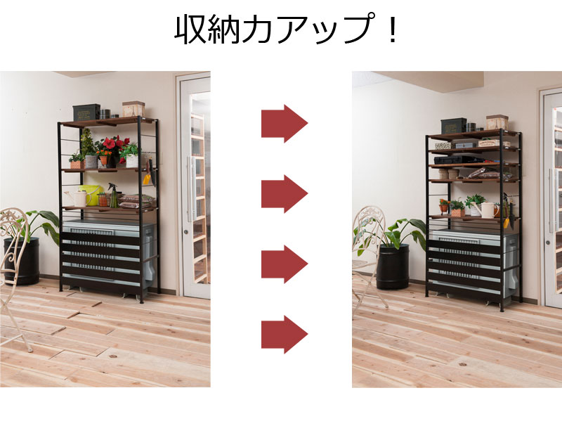 ガーデニング用品の収納やグリーンを飾るなど便利な上棚付きタイプとシンプルロータイプの展開。