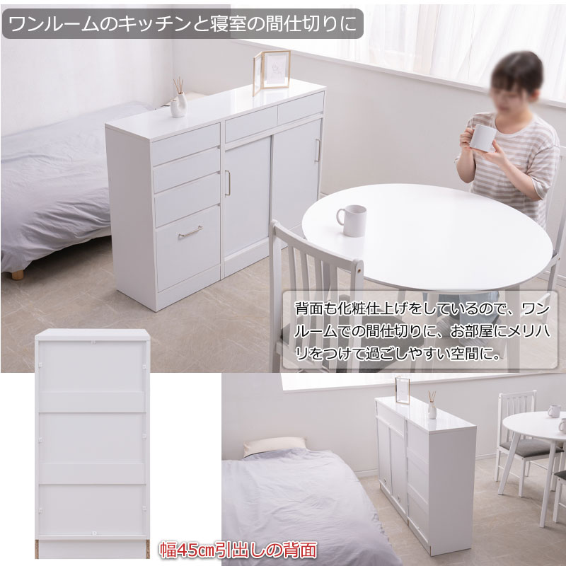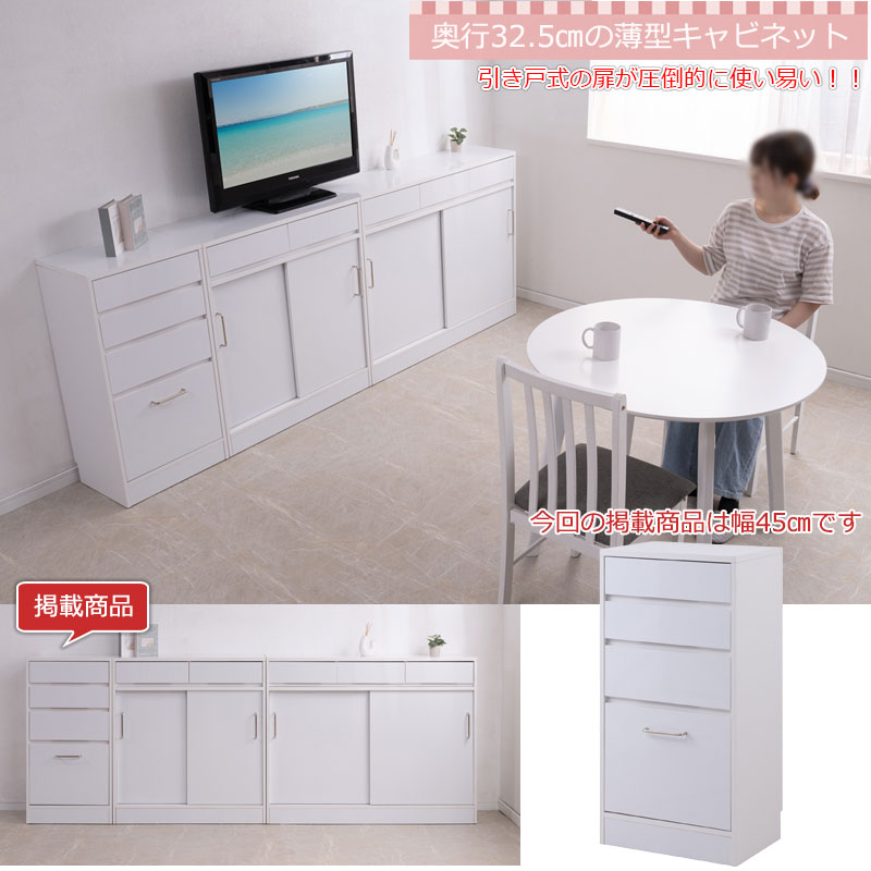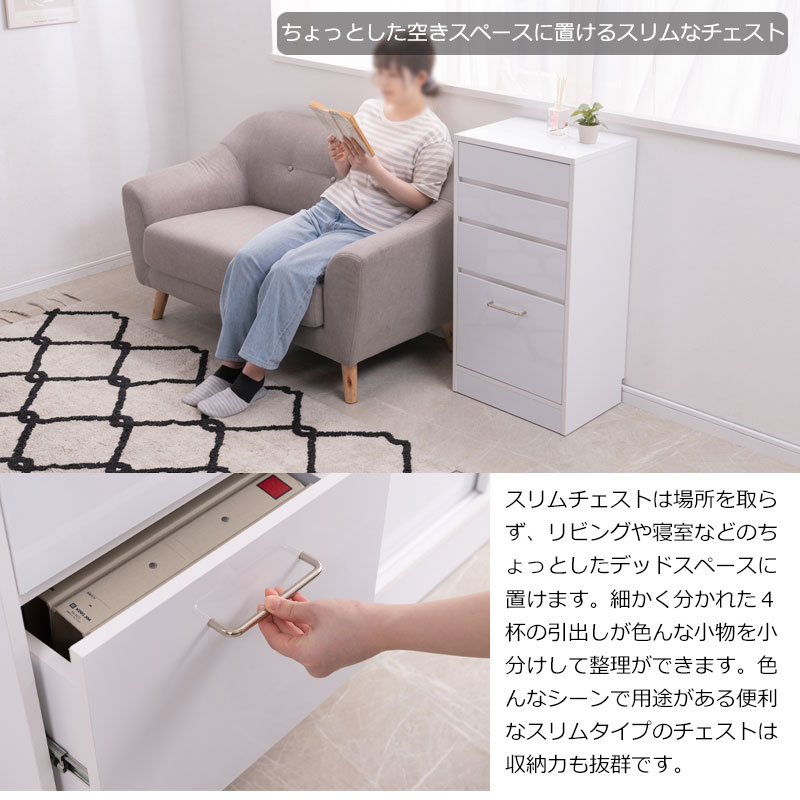 ■商品について/ハイグロスホワイト仕様!白が際立つ【SIRO】シロシリーズ。薄型スリム設計でデッドスペースを造り付けの様なスッキリとしたデザインで大量収納が可能。スリムチェストタイプは細かく分かれた4杯の引出しが雑多になりがちなリビングの小物を小分けして整理整頓ができます。最下段の深めの引出しはスライドレール付きで出し入れ楽々。A4ファイルを収納したり、浅深で使い分け。全段ストッパー付で安全に使用可能。シリーズ並べて使用やデスク下、窓下など薄型設計ならではの使い勝手の良い収納ラック。また80、110サイズのキャビネットは引き違い戸で前方に開閉スペース不要という点も高ポイント。庫内は可動式棚板で自在に位置替えが可能。