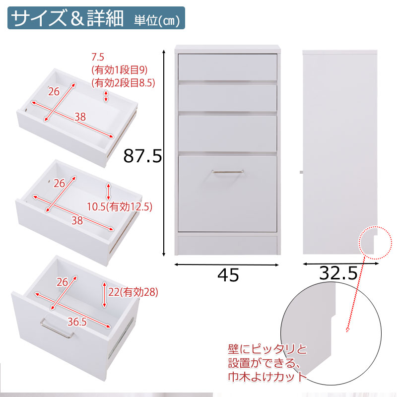■引出内寸/(約)幅(上から)38(最下段)36.5×奥行26×深さ(上から)7.5(有効9)・7.5(有効8.5)・10.5(有効12.5)22(有効28)cm