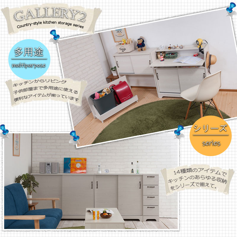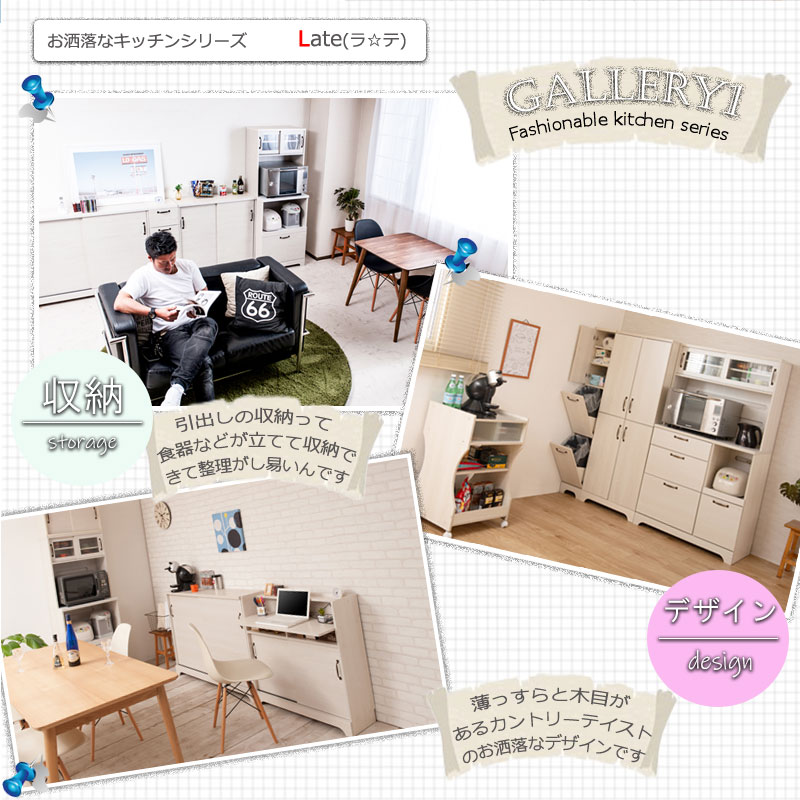 ■商品について/フレンチカントリーチックに仕上げた『Late』ラテシリーズ。シンプルな中に重厚感あるトランク取っ手、台輪部をアーチ状にくり抜くなど、インテリアになじみやすく、それでいて存在感のある家具をイメージしたカントリーライン。扉は引戸式にし、狭い部屋でも使いやすく、限られた空間に収納機能を凝縮。キッチンボードは背丈を少し低く、上台を奥まらせたことで、圧迫感のないスタイルに。さらに収納を追加したい方に上置きも取りそろえ、間仕切りにも使えるカウンターやカウンター下・リビングボードとして薄型引戸キャビネットもラインナップ。『Late』シリーズは、やさしい木目で一人暮らし、二人暮らしにも使いやすいサイズ感がうけています。
